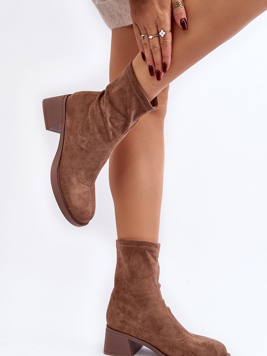 Cizme de damă de tip slip-on realizate din eco-suede. Așezate pe un toc bloc jos. Deget de la picior rotunjit. Partea superioară până la gleznă. O croială clasică care se potrivește cu aproape orice ținută de toamnă!
