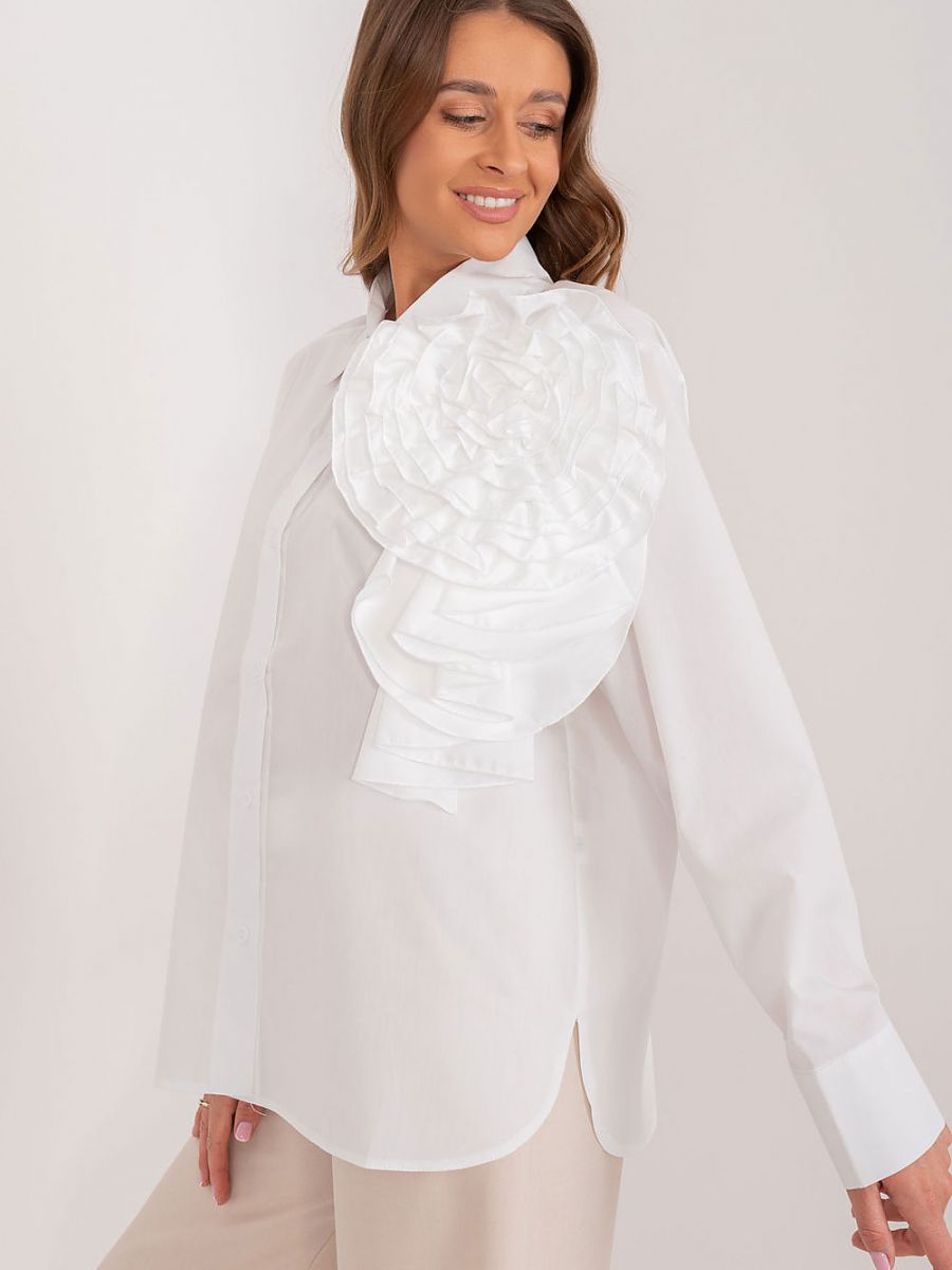 O cămașă pentru femei care pune în valoare stilul feminin într-un mod elegant. Este confecționată dintr-o țesătură netedă care oferă confort și libertate de mișcare. Croiala sa clasică cu nasturi o face ideală pentru multe ocazii, în special pentru cele mai formale. Pe partea din față, la nivelul umărului stâng, se află o floare mare decorativă din țesătură care adaugă un farmec unic și subtilitate cămășii. Mâneca lungă accentuează eleganța și clasa cămășii, potrivindu-se perfect cu o mare varietate de stiluri. Materialul principal utilizat pentru cămașă este bumbacul de înaltă calitate, care asigură o respirație naturală a pielii și o purtare confortabilă pe tot parcursul zilei. Această cămașă este alegerea perfectă pentru femeile care apreciază eleganța și stilul individual în orice situație.