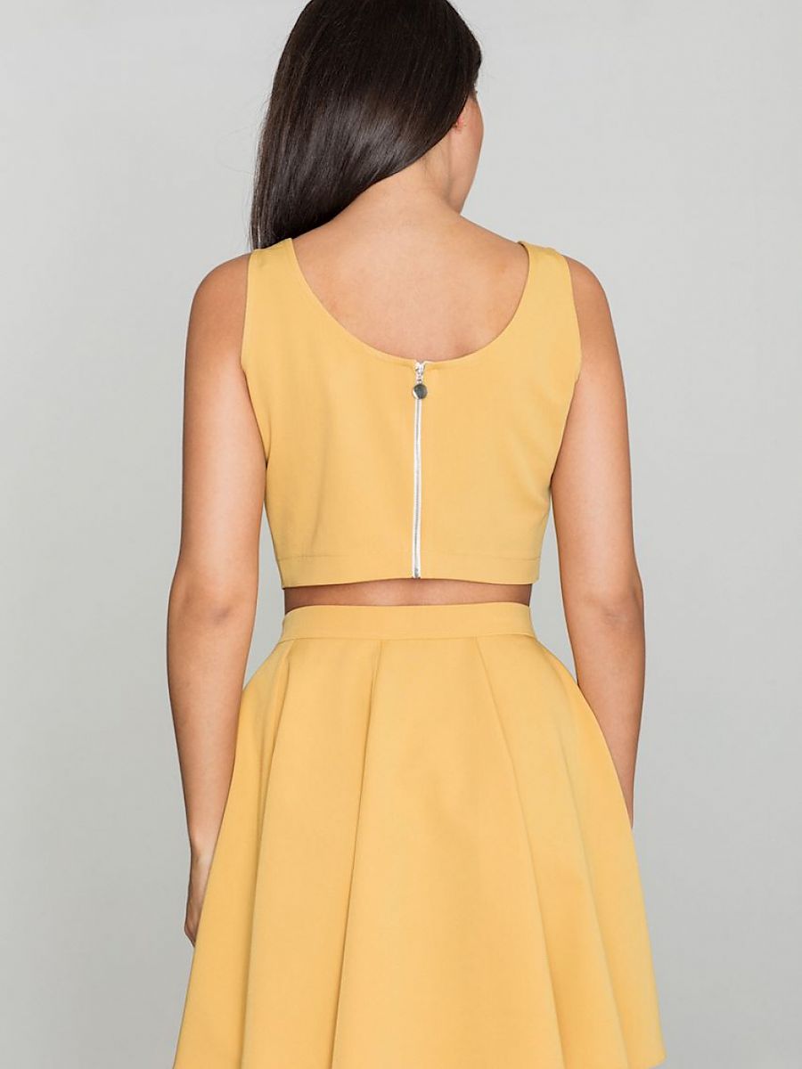 Top scurt, lejer, cu o fustă evazată, în cușete. Partea superioară cu fermoar decorativ argintiu la spate adaugă eleganță. Croiala lejeră a fustei adaugă confort pentru purtarea zilnică. Un set pentru femeile cărora le place să iasă în evidență, la modă și feminine.