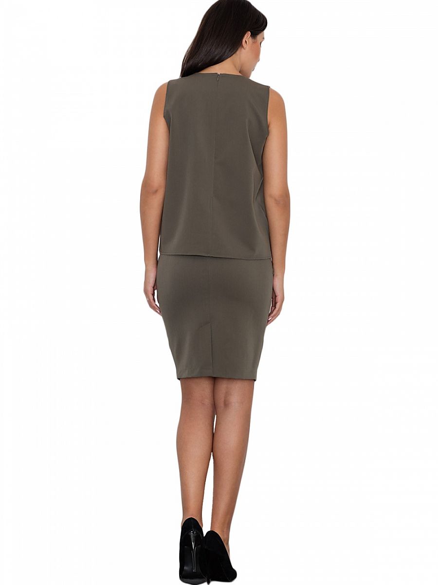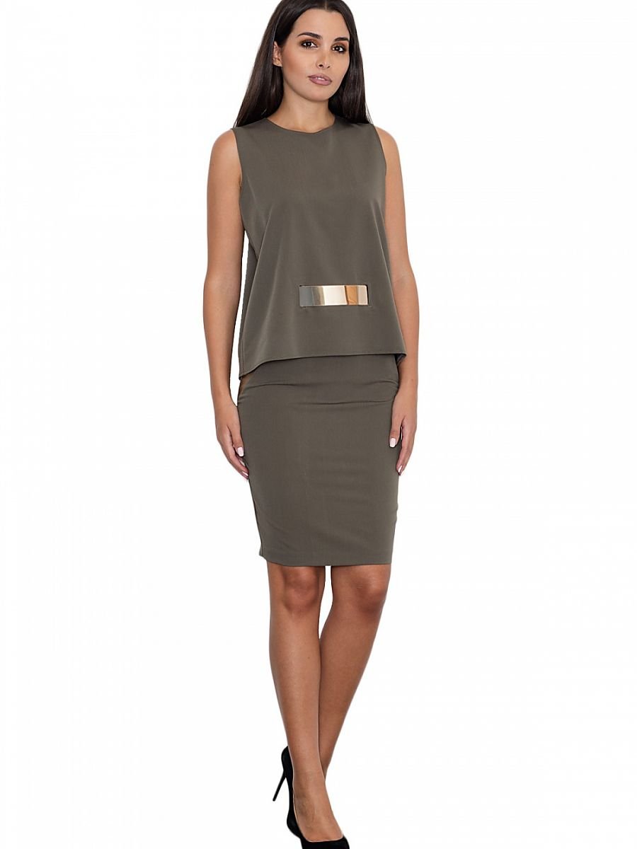 Set elegant într-o versiune simplă. O bluză cu un accent decorativ auriu adaugă șic și modernitate. Fustă ajustată înainte de genunchi cu inserții din piele ecologică, fermoar acoperit. Setul este perfect pentru multe ocazii de zi și de seară.